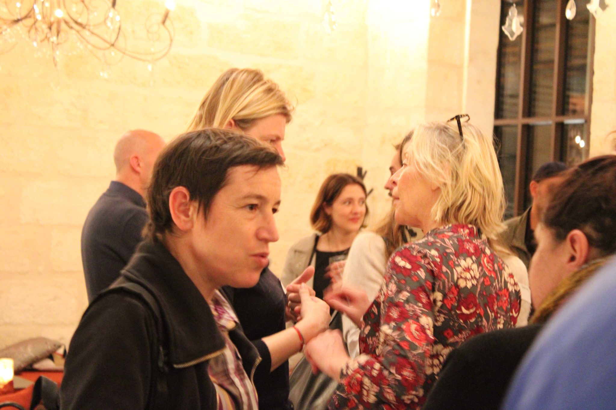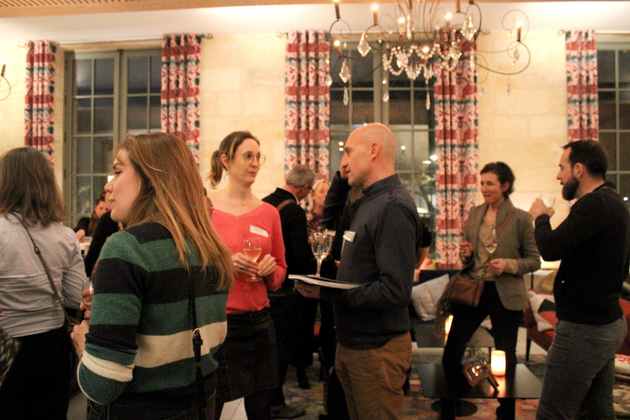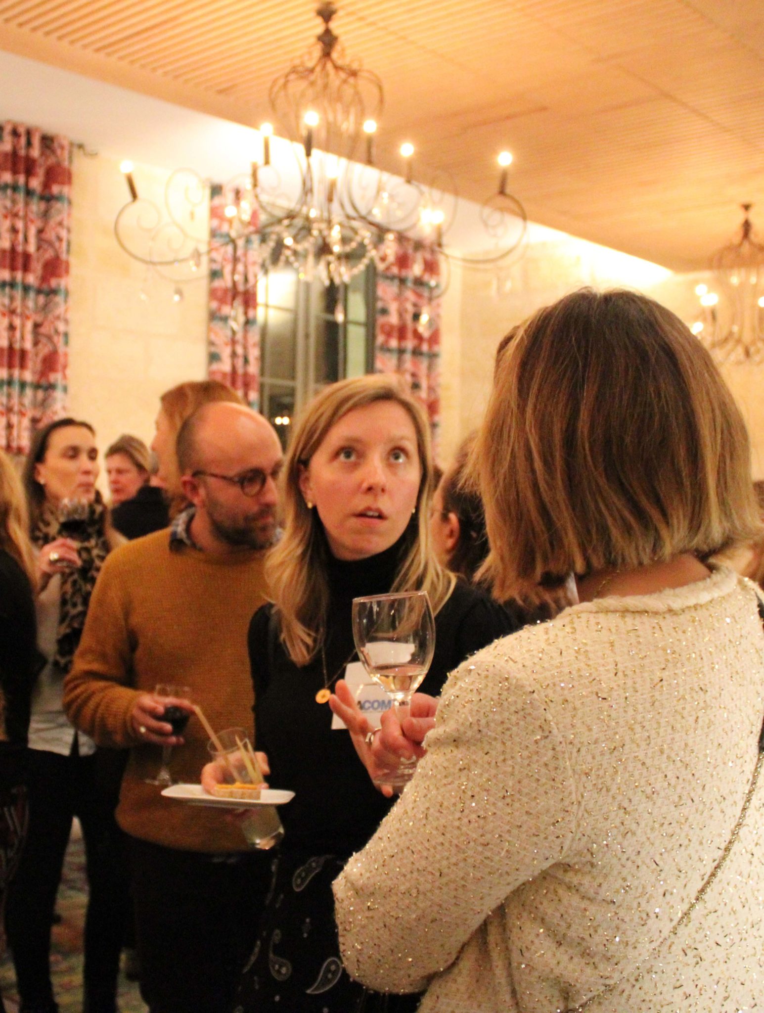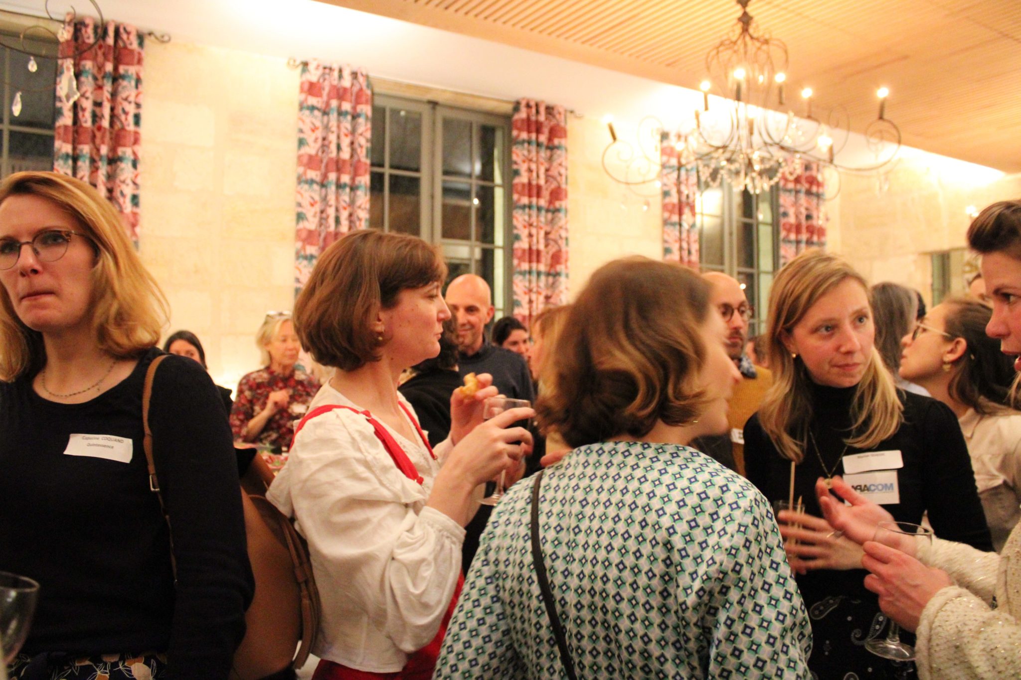 Traduction : ci-dessous une collection de gens heureux de se retrouver, de se rencontrer, et de discuter autour d’un verre en grignotant…
